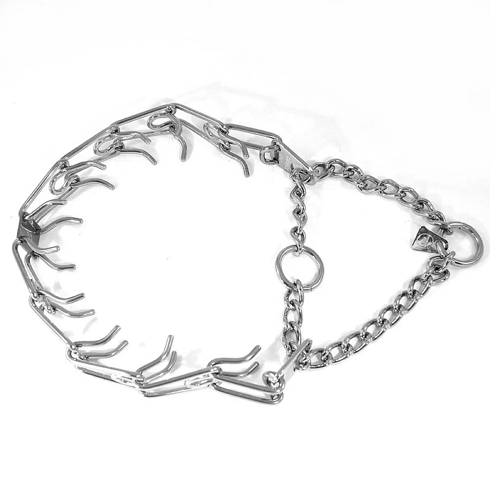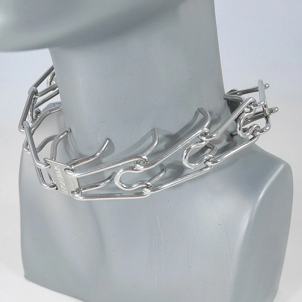 Das Dornenhalsband ist aus Edelstahl. Die Stacheln sind symmetrisch angeordnet, vorne ist eine kleine Platte, damit keine Stachel direkt mittig auf den Kehlkopf oder den Adamsapfel drücken.