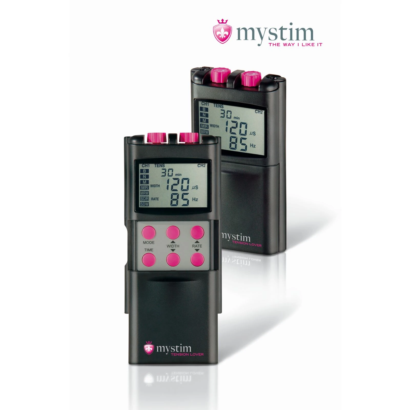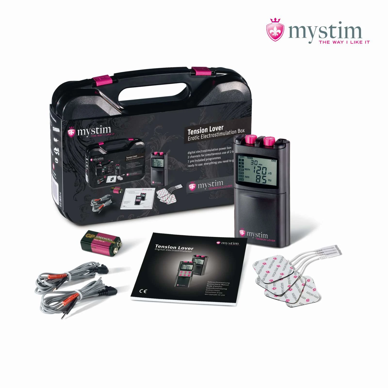 Mit dem Tension Lover kannst Du eine nicht enden wollende Stimulation erfahren, die je nach Einstellung als sanftes Kribbeln, rhythmisches Pulsieren oder sinnliches Stoßen zu spüren ist. Dabei werden Deiner Phantasie und Experimentierfreude keine Grenzen gesetzt. Dank der 2 Kanäle können 2 unterschiedliche Estim-Toys gleichzeitig angeschlossen und benutzt werden für mehr Spaß zu zweit, oder auch alleine. Alle Einstellungen können dabei bequem vorgenommen und mittels des extra großen Displays kontrolliert werden. Neben der manuellen Einstellungsvornahme kannst Du auch zwischen 7 vorgespeicherten Programmen wählen. Mit dem Mystim Tension Lover ist alles möglich von zart bis hart.