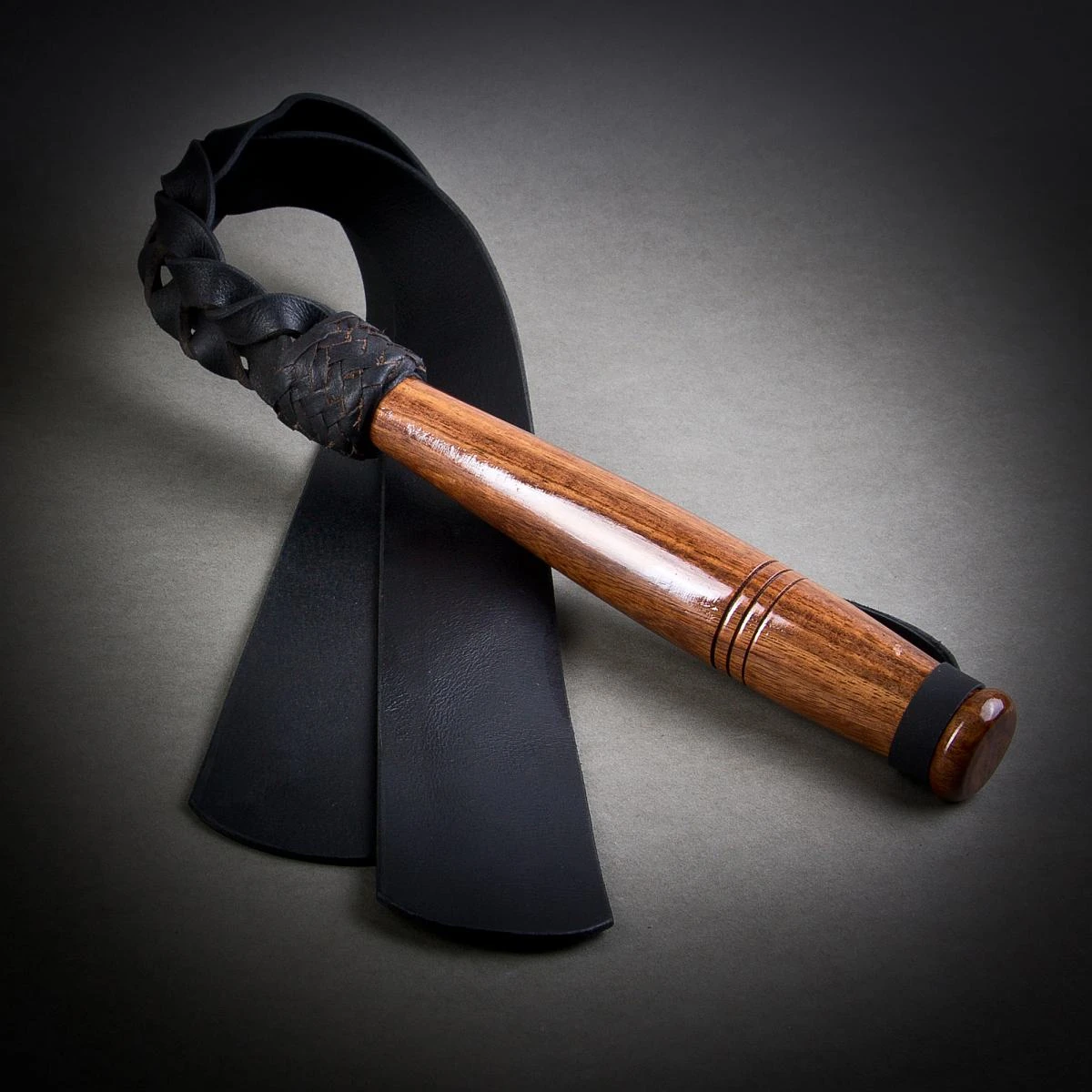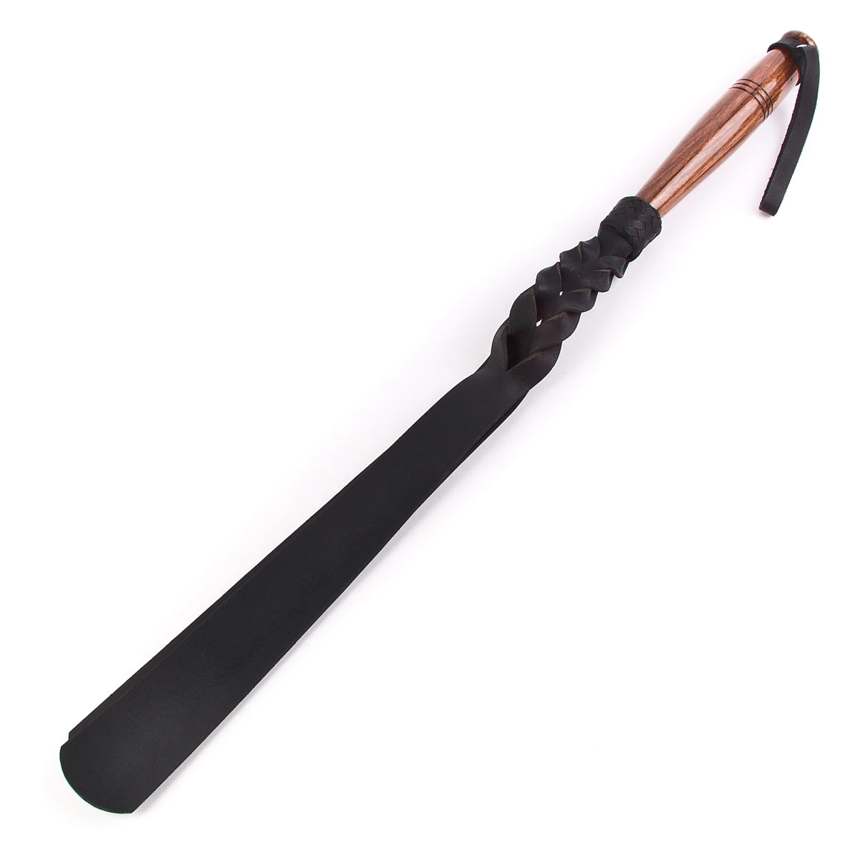 Das Doppelpaddel »Dohara« besticht durch seine außergewöhnliche Optik bestehend aus einem edlen, auf Hochglanz polierten Holzgriff und geflochtenem Sattel-Leder, das in eine breite, vorne abgerundete Doppelklatsche übergeht.