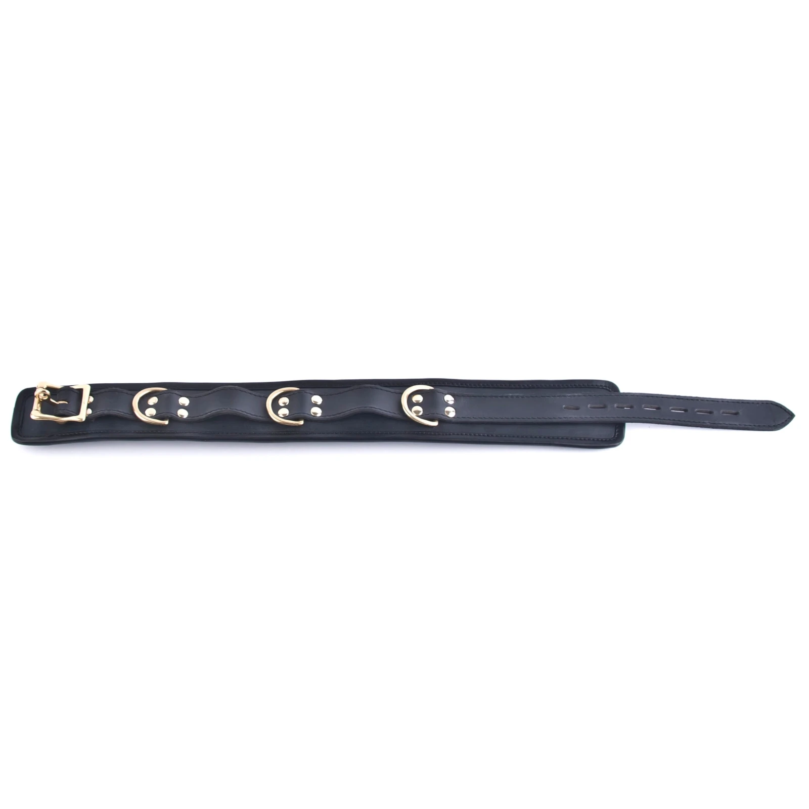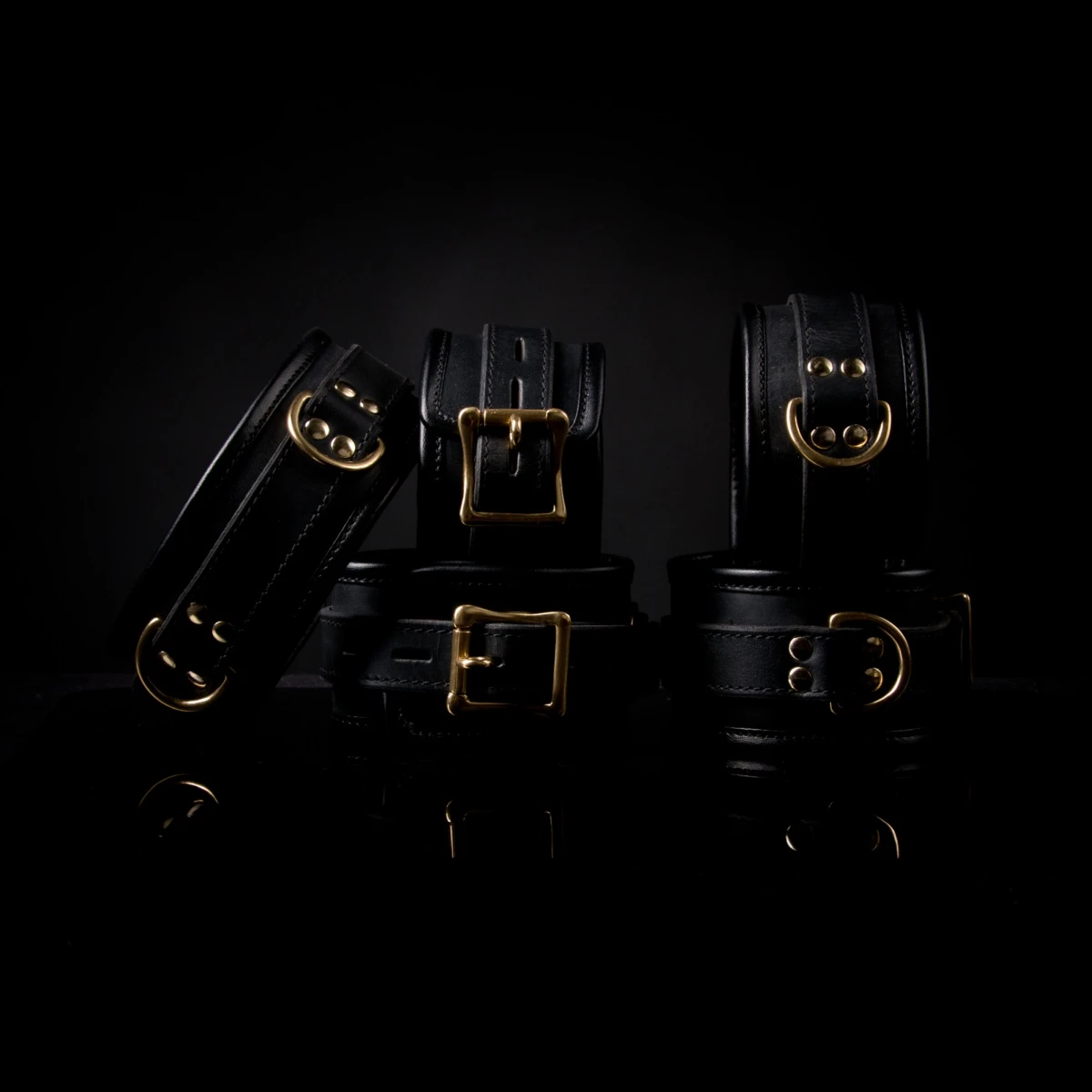 Alle Elemente sind größenverstellbar und mit geschweißten D-Ringen ausgestattet. Die Nieten und D-Ringe sind aus Messing, was dem Set einen edlen Touch verleiht. Die massiven Rollschnallen haben einen Ring am Dorn. Mit einem kleinen Schloss gesichert können die Manschetten gegen unerwünschtes Ausziehen gesichert werden.