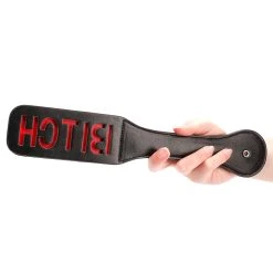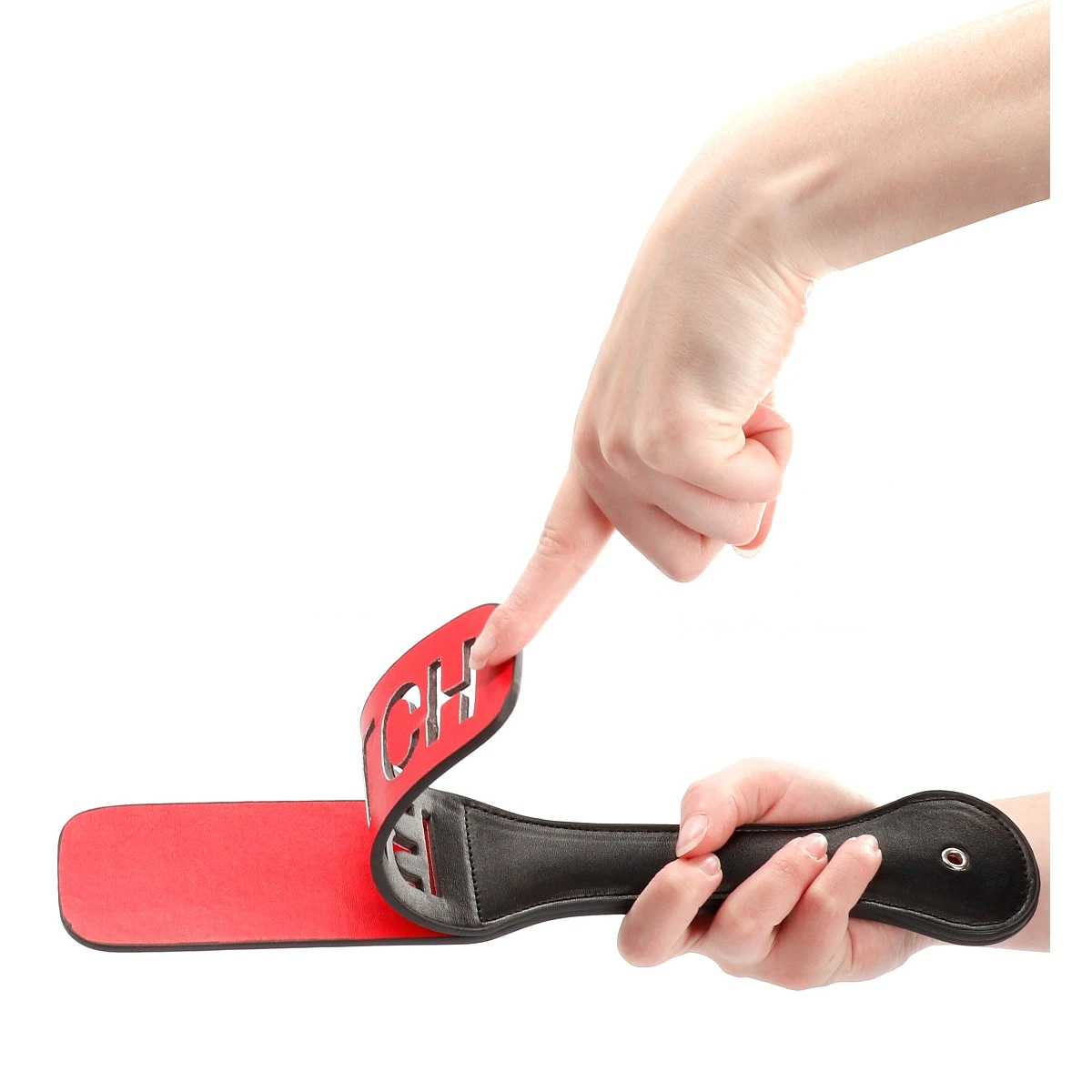Das Wichtigste ist die Doppelklatsche: sie erzeugt einen tollen „Stereo“-Sound beim Zuschlagen und eignet sich sowohl zum Aufwärmen als auch zum Bestrafen. Während die glatte Seite des Paddels herrlich schöne Rötungen hinterlässt, kann man mit einem beherzten Schlag mit der Schrift-Seite das Hinterteil seiner Wahl mit der Buchstabenkombination „BITCH“ markieren. Dazu ist das Wort „BITCH“ aus dem Kunstleder ausgestanzt, was einen schönen Abdruck auf der nackten Haut hinterlässt. Auf dem Po erscheint das Wort richtig herum, ist also auf dem Paddle in Spiegelschrift zu lesen.