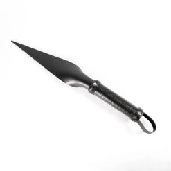 Der kräftige Griff ist mit genarbtem Leder überzogen. Dekorative Polsternägel zieren den Griff, der oben und unten mit einem geflochtenen Rand endet. Dank der praktischen, kurzen Schlaufe lässt sich das Paddel problemlos aufhängen.