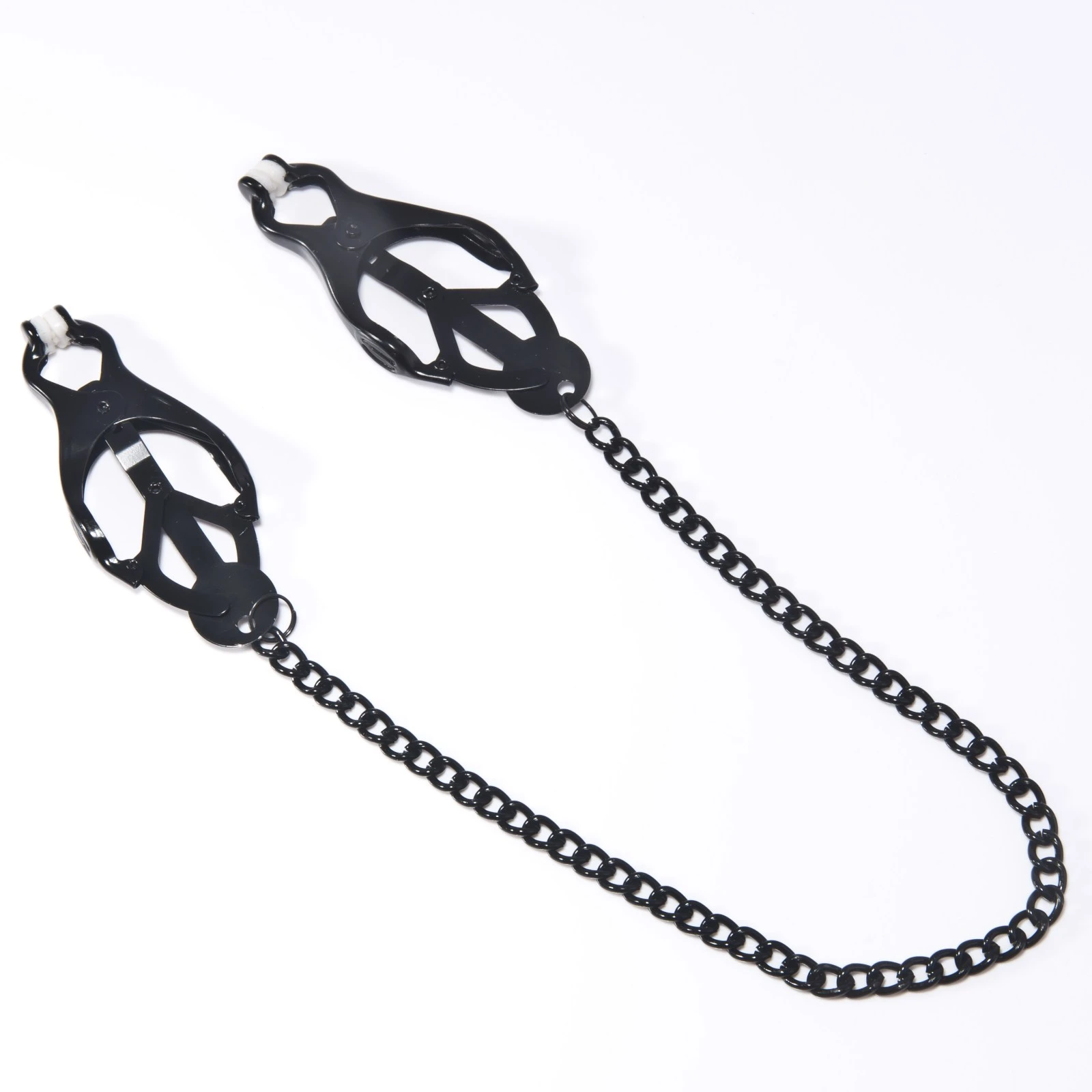 Traditionelle Clover Clamps oder Japanische Klammern mit Kette in schwarz. Die Brustkette schmückt nicht nur: Du kannst die Klammern beschweren in dem Du dort Gewichte einhängst. Auch ein Seil kann man dran befestigen, damit Subbie einen passenden Parkplatz im Club findet oder Dir brav hinterher läuft. Diesen Klammern kann man sich einfach nicht entziehen!