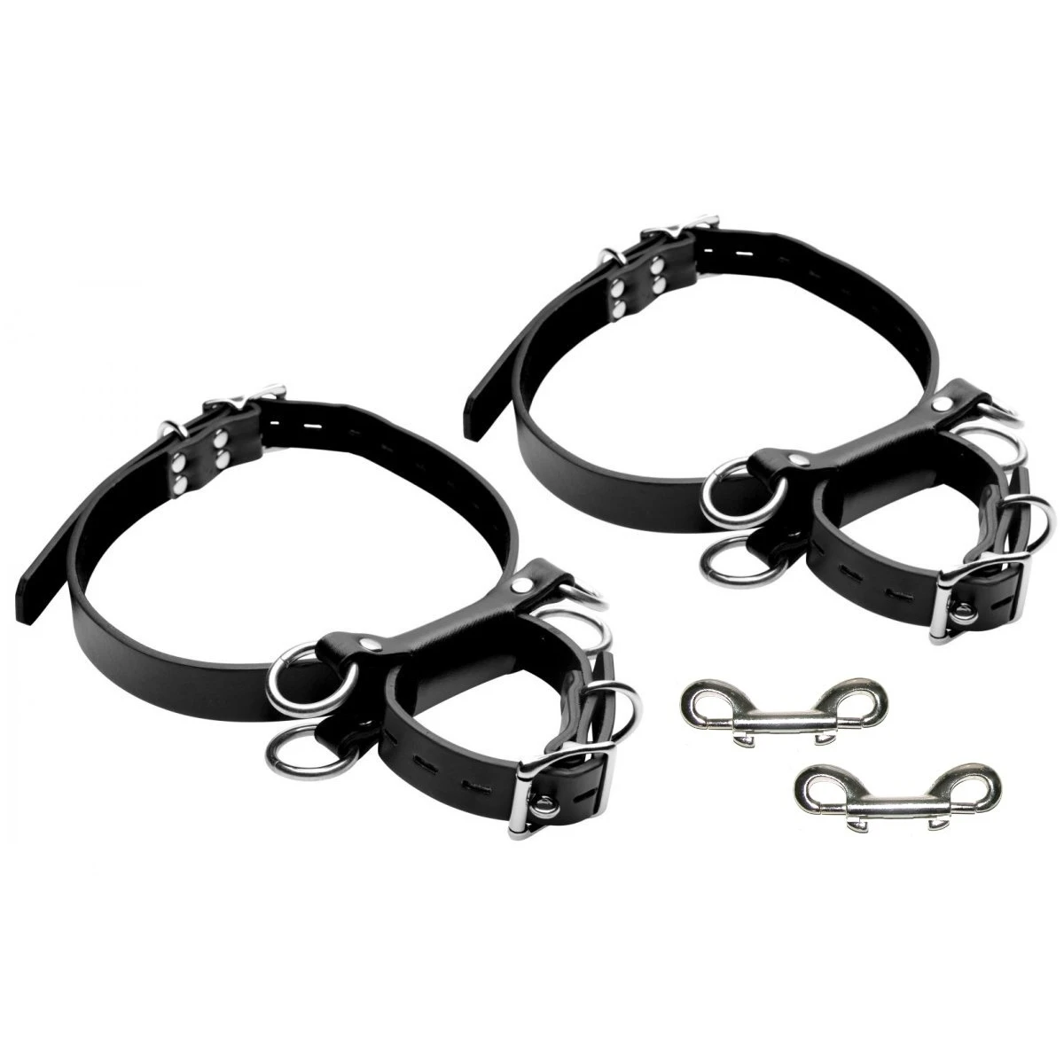 Die Frogtie-Fesseln sorgen dafür, dass Oberschenkel und Knöchel aufregend eng aneinander gefesselt werden können. Seitlich sind an jeder der beiden Fesseln 4 Ringe angebracht. Damit kann die Fesselung erweitert werden. Du kannst z.B. auch eine kurze Spreizstange dazwischen befestigen. Oberhalb der abschließbaren Schnallen sind D-Ringe angebracht. Auch mit denen kann man spielend die Fesseln erweitern oder sie fixieren. Als Oberschenkel-Hand-Fesseln lässt sich dieses System einsetzen. Kurzum: der Fantasie sind kaum Grenzen gesetzt.
