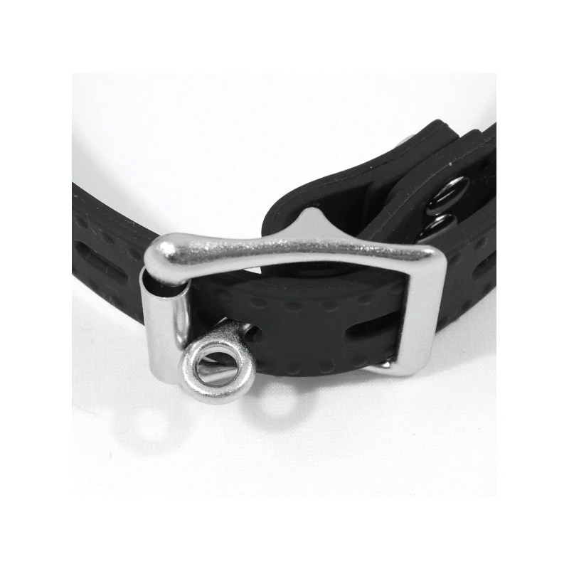 Die schwarze Beißstange ist aus weichem Silikon, stinkt nicht und ist geschmacksneutral. Zwei Metallringe bilden den Abschluss an der Trense und gehen in ein Verschlussband aus Silikon über.