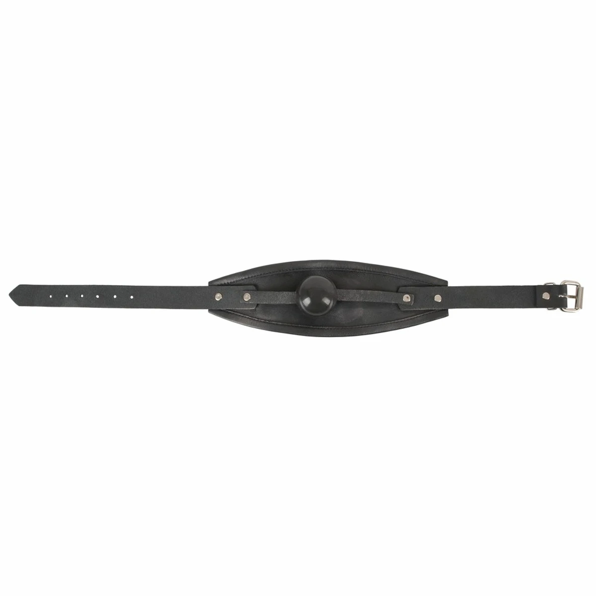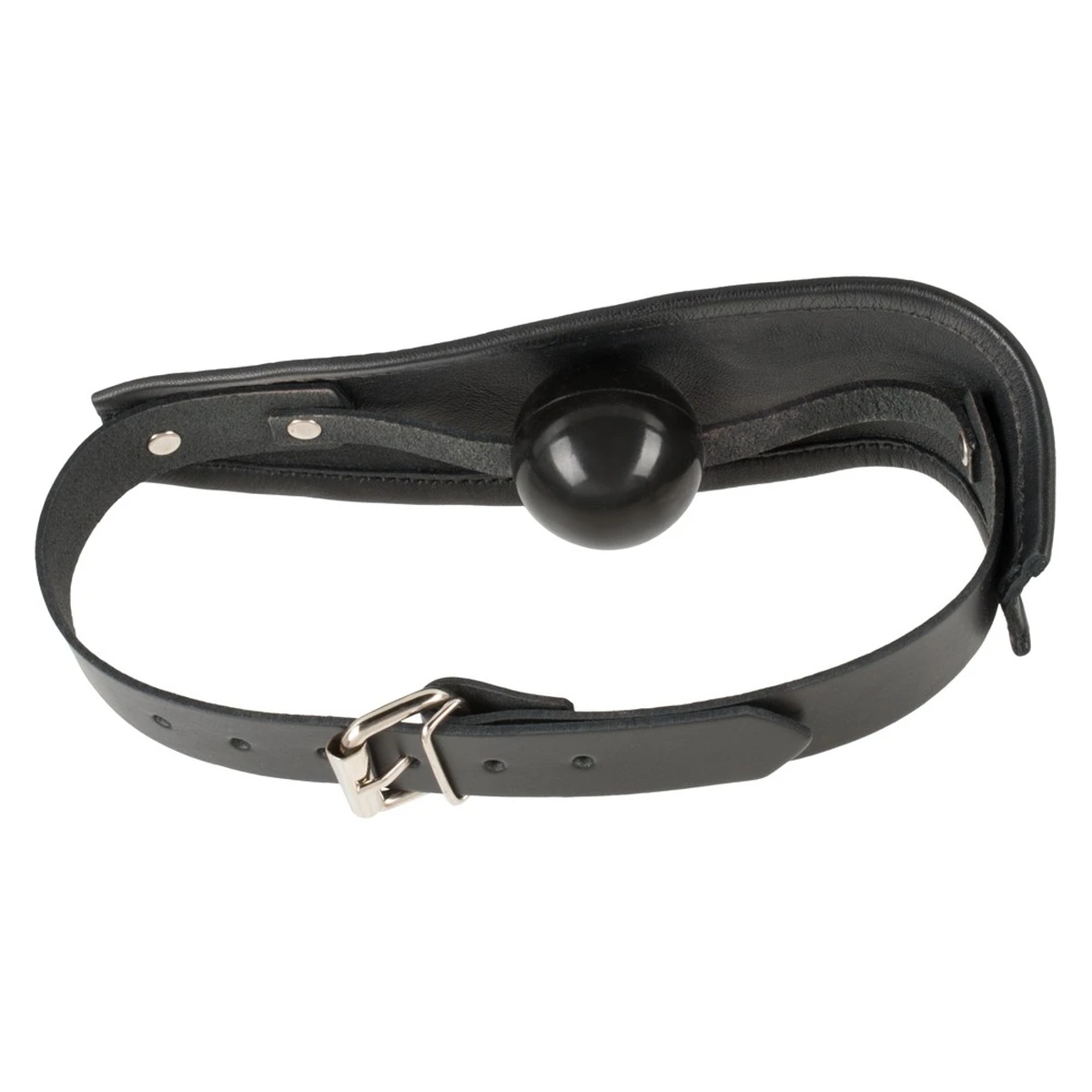 Der Knebelball besteht aus Silikon und wird durch Andruck der Lederplatte im Mund gehalten. Die Mundwinkel werden geschont, da der Lederriemen nicht einschneiden kann.