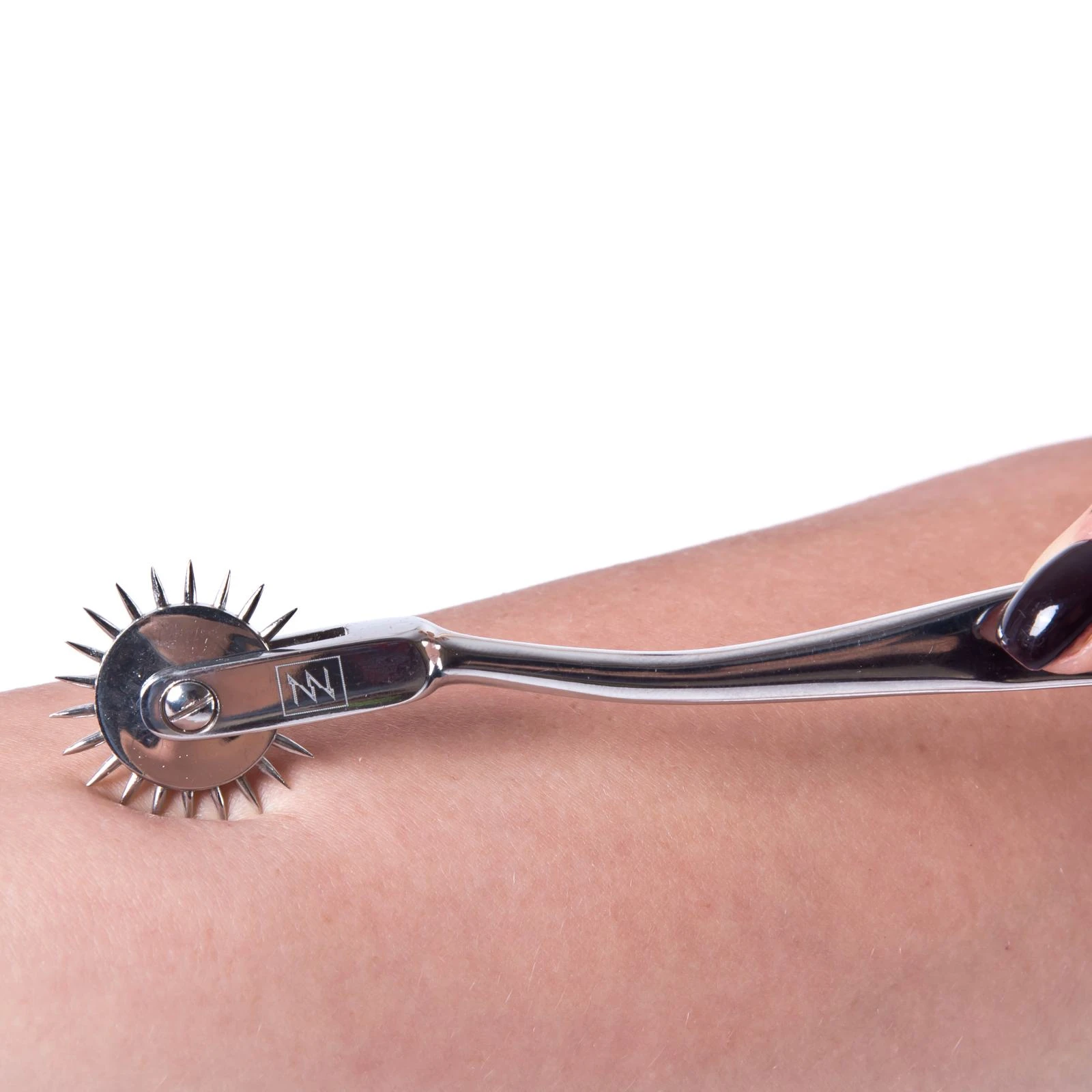 Das Pinwheel, Nervenrad oder Wartenbergrad spielt seine Reize aus, wenn Sub die Augen verbunden hat und das spitze Rädchen seine Reise über den Körper beginnt. Die funkelnden Nadelspitzen suchen ihren Weg über empfindlichste Körperteile und lassen eine Gänsehaut der Lust auf der Haut erscheinen. Je nachdem wie stark der Druck auf die Haut ist, schwankt das Gefühl zwischen sanften Schauern und nadelspitzem Stechen.