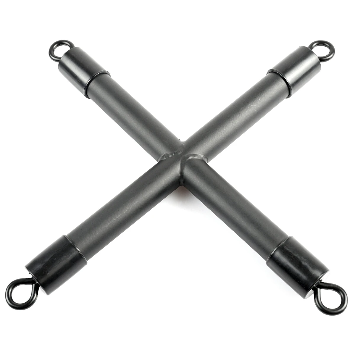 Das Hogtie-Kreuz selbst ist aus Metall. Die 4 Ringe sind drehbar mit dem Metall verbunden.