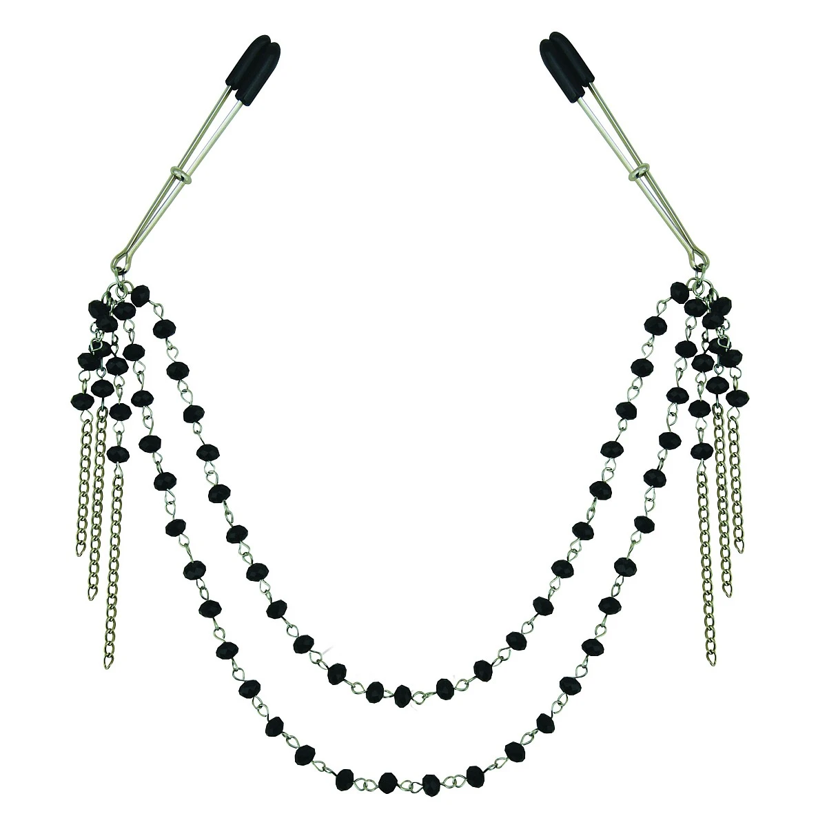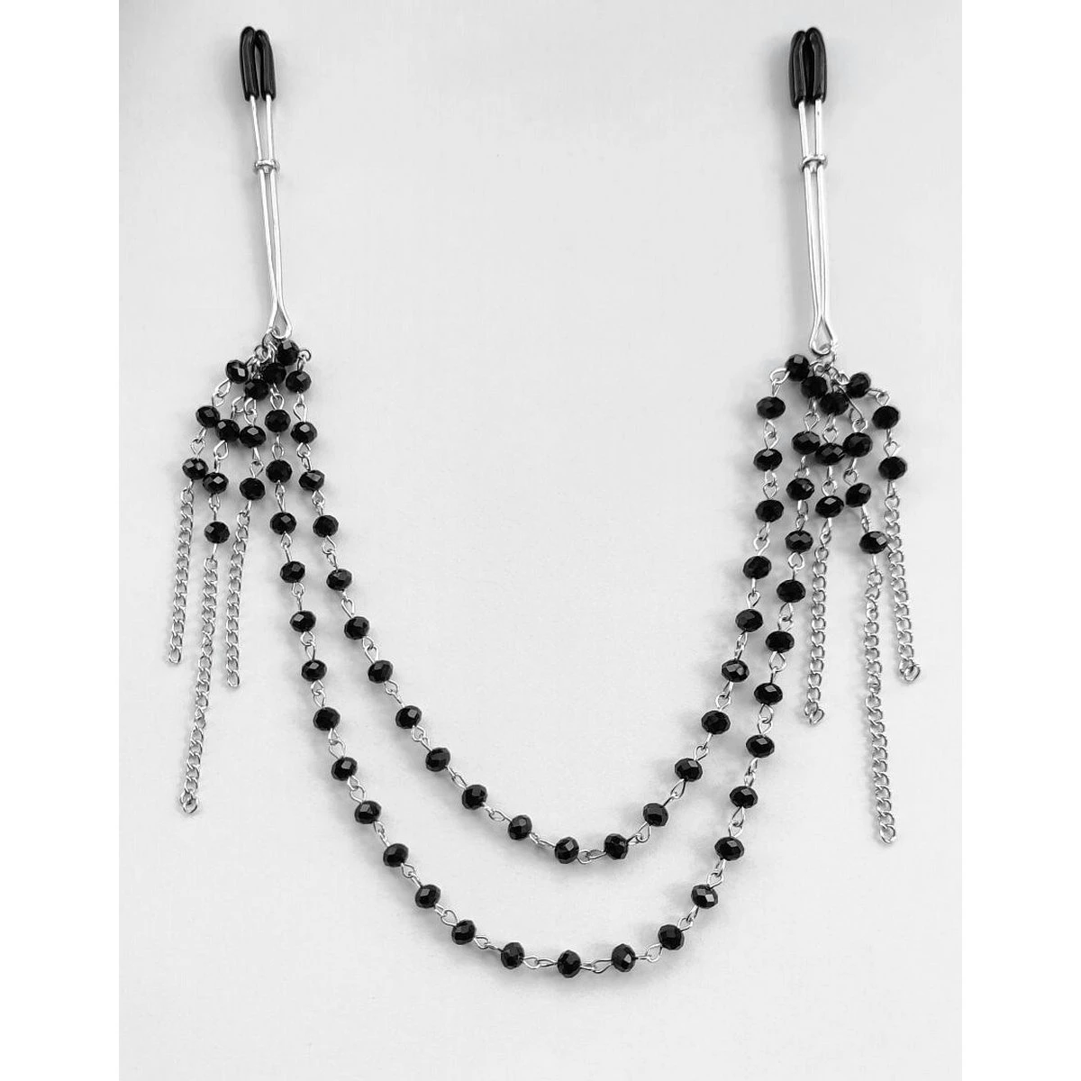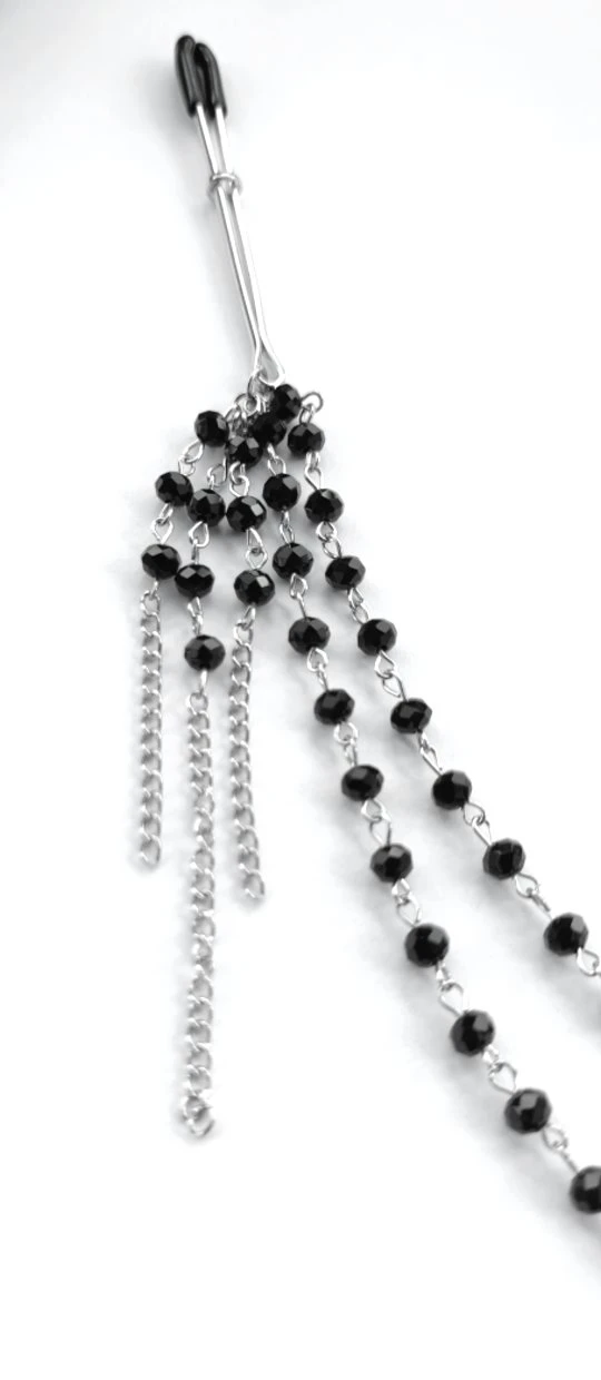 Die Kette zwischen den beiden Nippelklemmen ist besetzt mit vielen facettierten, schwarzen Juwelen aus Glas. Sie dient aber nicht nur dekorativen Zwecken, sondern erzeugt durch ihr Eigengewicht auch einen leichten, konstanten Zug an den Brustwarzen, was einen dauerhaften, passiven Reiz auslöst.