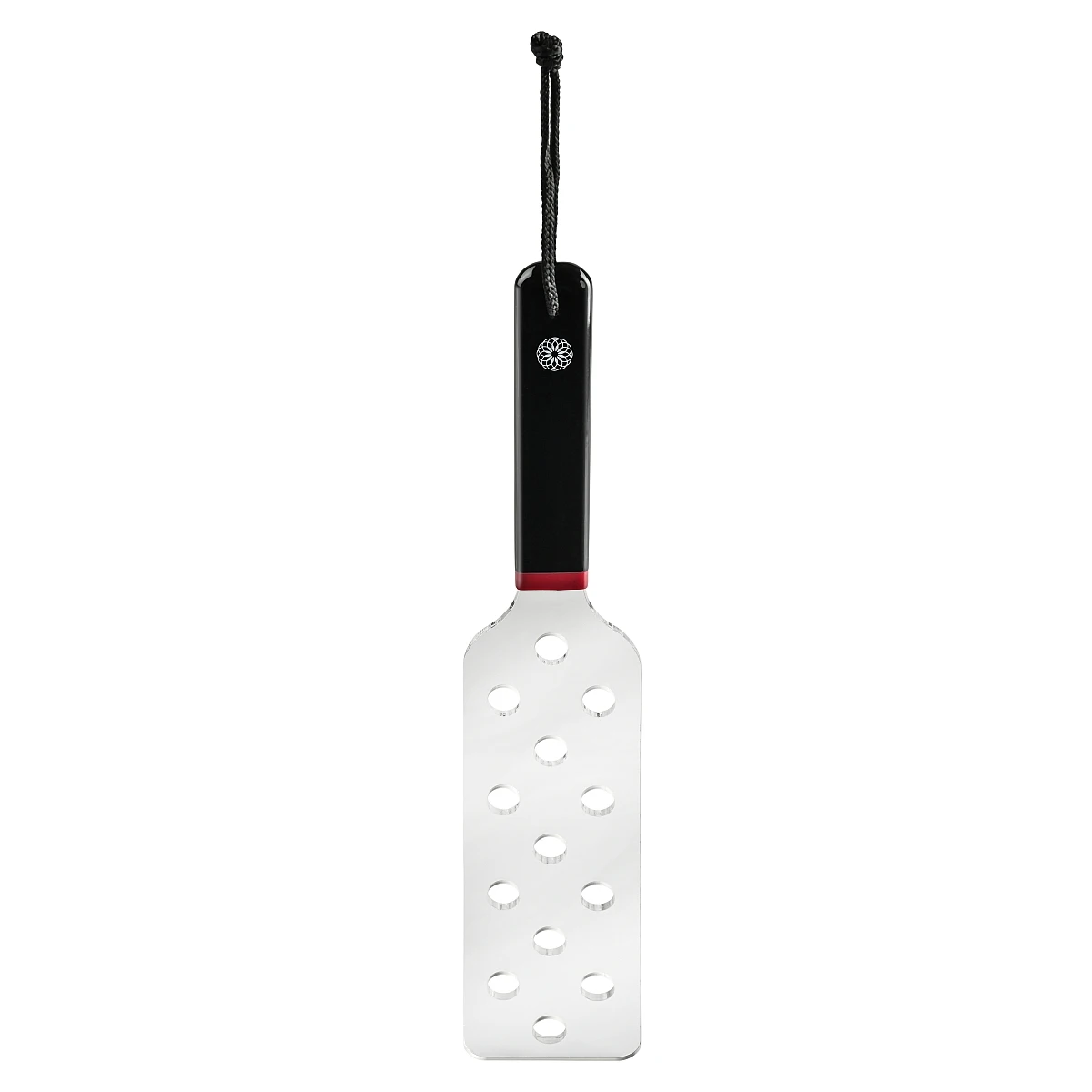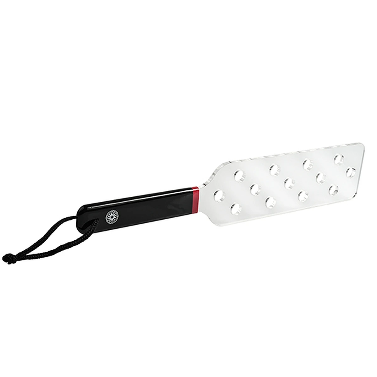 Es ist nicht übertrieben, wenn wir hier sagen: Dieses Paddel ist eines unserer heftigsten Schlaginstrumente. Es tut RICHTIG weh, wenn es auftrifft, denn Acryl ist bekanntermaßen unnachgiebig, was schnell zu Rötungen im Schlagbereich führt. Der Spanker ist gelocht. Dadurch entweicht die Luft unter dem Paddel. Es bildet sich des Schlages kein schützendes Luftpolster über der Haut. Laute Klatschgeräusche werden dadurch übrigens verhindert, laute Schreigeräusche von Sub eher vermehrt ^^. Durch die Löcher entstehen aparte Muster auf Subbies geröteter Haut. Ein echtes Strafinstrument!