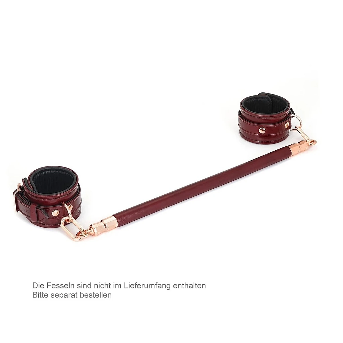 Die edle LiebeSeele®-Spreizstange besteht aus stabilem Eukalyptus-Holz und ist mit weinrotem Rindsleder ummantelt. Zusammen mit den roségoldenen Metallbeschlägen strahlt sie eine exklusive Prise Luxus aus und sorgt beim BDSM-Spiel für das gewisse Flair. Liebevoll und sorgfältig in Handarbeit gefertigt, aus hochwertigen Materialien bestehend, ist diese Spreizstange nicht nur optisch außergewöhnlich. Sie ist durch ihre drehbaren Ösen und beiliegenden Schnappkarabiner aus Metall auch funktionell und eignet sich zum Spreizen von Armen und Beinen im Stehen oder im Liegen. Ein ungewolltes Öffnen der Fesseln ist somit ausgeschlossen. Handfesseln oder Fußmanschetten sind nicht im Lieferumfang enthalten und passend aus der gleichen Serie erhältlich.