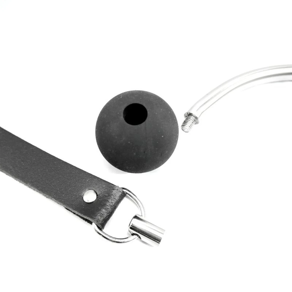 Der Stahlbogen des Knebels lässt sich am Rand aufschrauben. So kann der Ball abgezogen, gereinigt und auch ausgetauscht werden. Das Aufschrauben hat noch einen Vorteil: wenn Du noch ein Loch im Lederband brauchst, kannst Du nur mit dem Band zum Schuster gehen, um ein weiteres Loch stanzen zu lassen und erntest keine Fragen oder süffisanten Blicke ^^