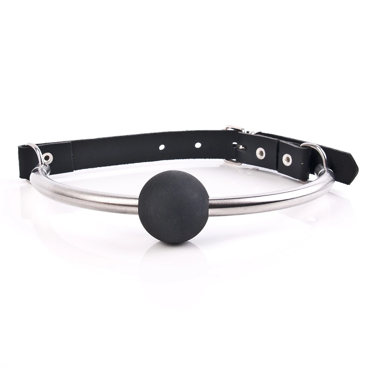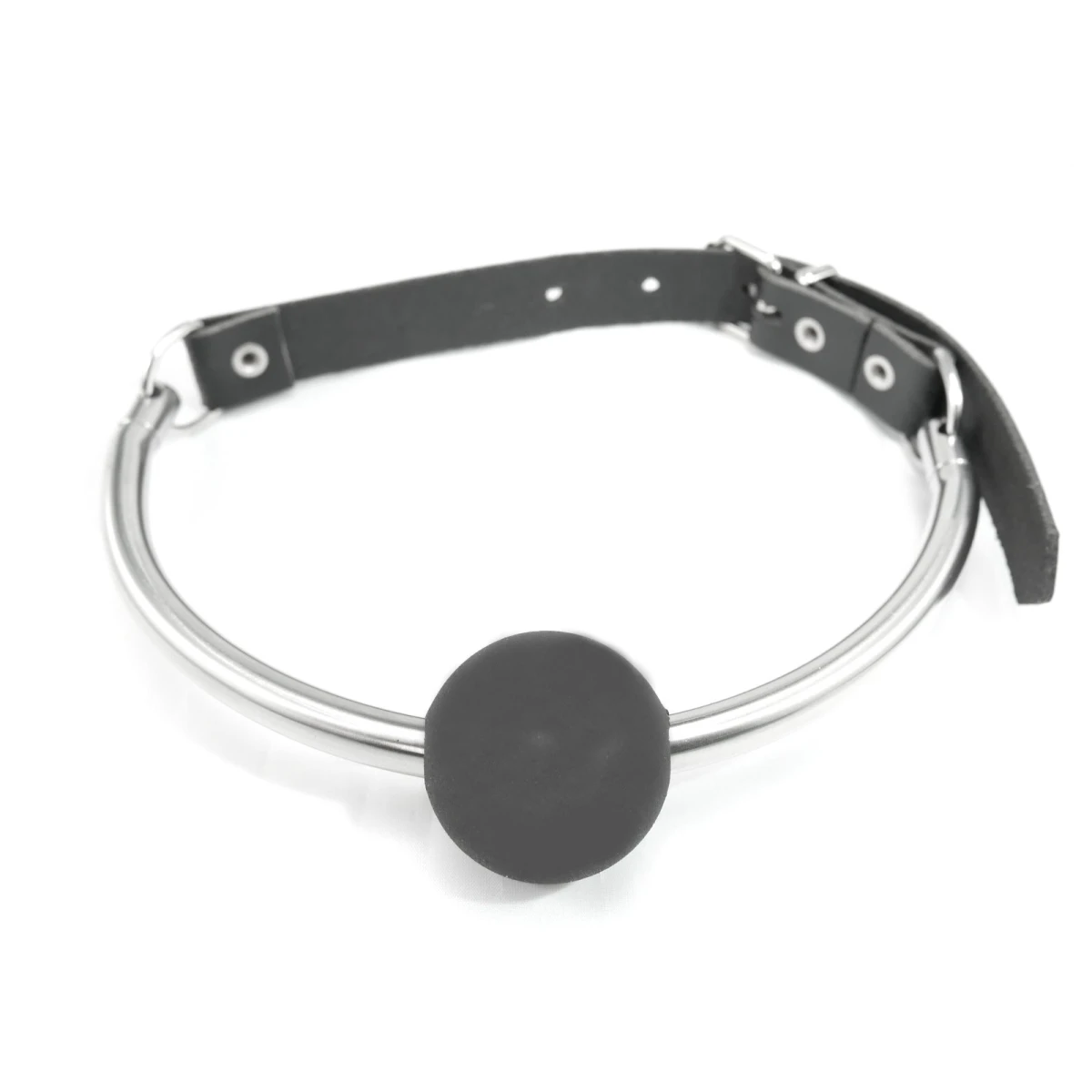 Der Ledergurt, der den Knebel an Ort und Stelle hält, wird mit einer Rollschnalle geschlossen. Diese Schnalle sitzt nicht in der Mitte, sondern seitlich versetzt, sodass die Schnalle im Nacken nicht stört.