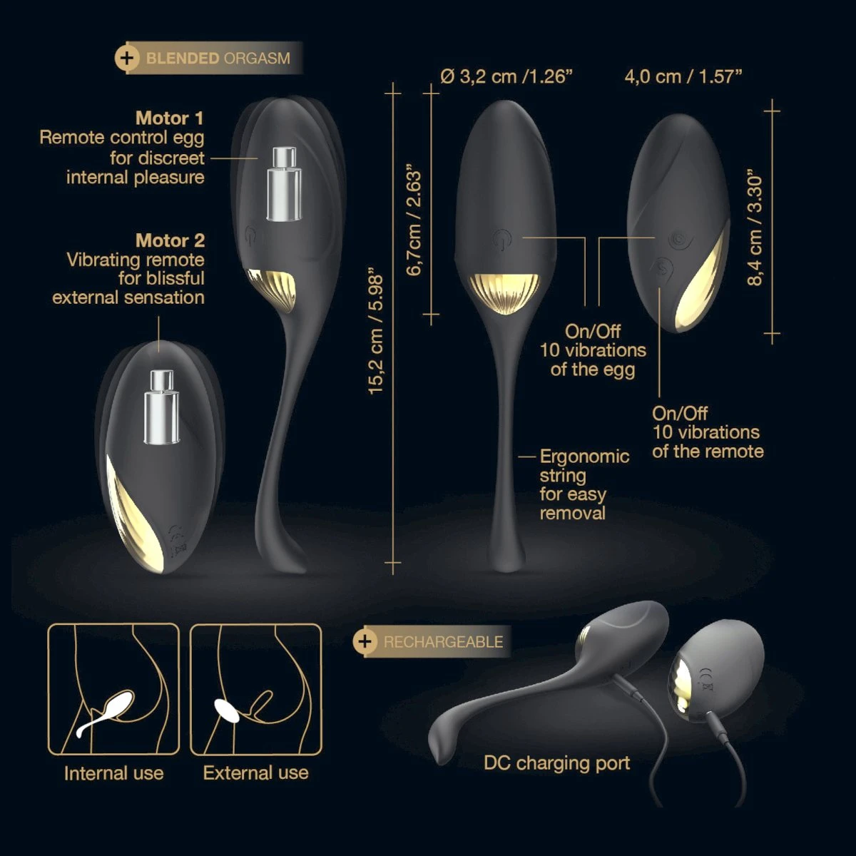 Das Vibro-Ei und die Fernbedienung sind aus körperfreundlichem Silikon, die goldfarbenen Zierelemente aus ABS-Kunststoff. Dank der seidigen Oberfläche lässt sich das Ei mithilfe einer Portion Gleitmittel einfach vaginal einführen und verweilt sicher an der richtigen Stelle. Mithilfe des integrierten Rückholbandes lässt es sich auch einfach wieder entfernen. Natürlich ist das Vibro-Ei wasserdicht, ebenso wie die Fernbedienung. Beides lässt sich über das beiliegende USB-Ladekabel laden.